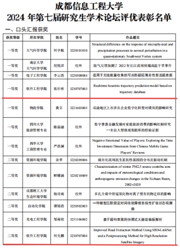 在激烈的学术竞争中,tyc33455cc太阳成集团的研究生们表现出色,取得了骄人的成绩。tyc33455cc太阳成集团的张杉彬同学凭借其研究项目“Real-time heuristic trajectory prediction model based on trajectory database”荣获一等奖,展现了同学们在实时启发式轨迹预测领域的研究实力。何允颢同学的“Improved Road Extraction Method Using SBD-LinkNet and a Postprocessing Method for High Resolution Satellite Imagery”获得了二等奖,体现了在高分辨率卫星图像道路提取技术方面的创新能力。
