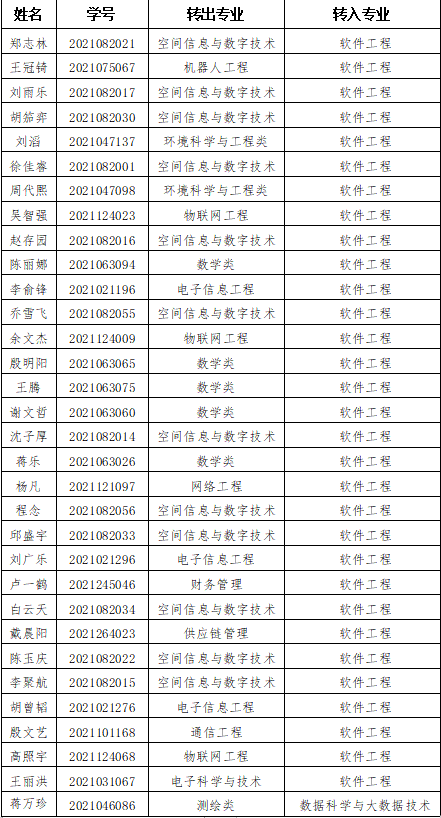 现将2022年拟转入tyc33455cc太阳成集团学生名单予以公示,公示时间为2022年1月17日-1月21日,公示期间如对软件学院转专业拟录取名单名单有异议,请邮箱联系tyc33455cc太阳成集团教务处教务科杨老师,邮箱:rjgcxyjx@cuit.edu.cn。公示期间如无任何疑问,即视为转专业成功。