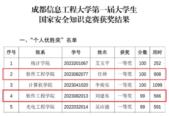 近日,学校第一届大学生国家安全知识网络竞赛活动落下帷幕,我院学子任帅、刘建东获得“个人优胜奖”一等奖,敬雨欣、官玉锋获得二等奖,李思雨、罗嘉豪、刘银、李天龙、陈锐获得三等奖,陈绍华荣获“优秀指导教师”,学院荣获“优秀组织奖”。