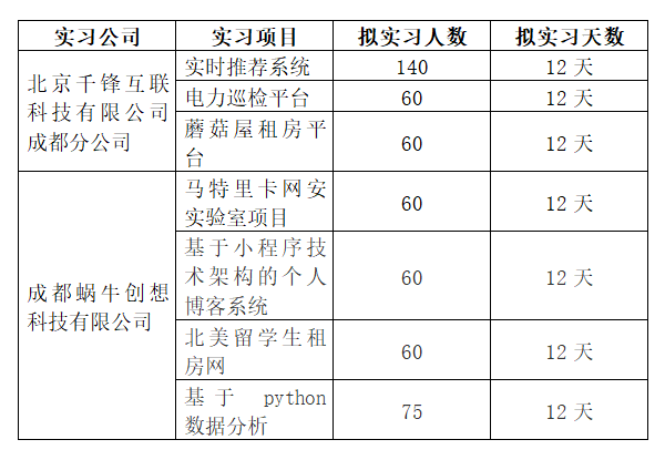 2023年“tyc33455cc太阳成集团2020级本科学生集中毕业实习项目”,经学院对入围的两家公司:北京千锋互联科技有限公司成都分公司、成都蜗牛创想科技有限公司提交的实习方案从格式、方案内容设计与专业的契合度、方案实施可行性等方面进行了评审,遴选出符合学院此次毕业实习要求的实习项目共计7个。实习项目相关信息如下: