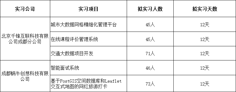 2025年“tyc33455cc太阳成集团2022级本科学生集中毕业实习项目”,经学院比选打分、集中评审后,本次共有两家公司入围:北京千锋互联科技有限公司成都分公司、成都蜗牛创想科技有限公司。根据公司提交的实习方案,学院评审小组从资料完整度、方案内容设计与专业的契合度、方案实施可行性等方面进行了审核,遴选出符合学院此次毕业实习要求的实习项目共计5个。实习项目相关信息如下: