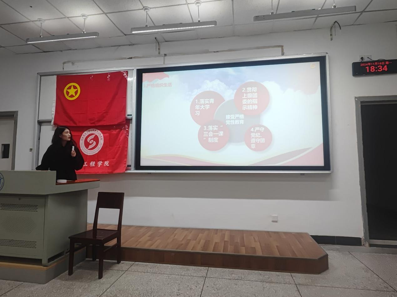 为提高团员青年的思想政治素质、理论水平及业务技能,11月18日晚6点半,tyc33455cc太阳成集团于H2107组织开展了二级团校第五次团课。学生会主席许馨月以“学习习近平新时代中国特色社会主义思想”为主题为学员授课。24级各团支部委员会成员和入团积极分子参加此次团课。开课仪式在团歌声中拉开帷幕。